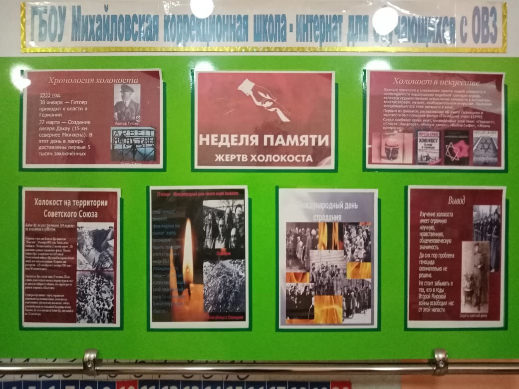 В рамках реализации плана мероприятий, посвящённых Международному дню памяти жертв Холокоста, в ГБОУ МКШИ прошли классные часы и тематические уроки. В фойе школы оформлен информационный стенд "Память без срока давности", во всех классах был организован просмотр рекомендуемого фильма "Холокост. Геноцид европейского еврейского народа". Основная цель подобных мероприятий - развитие чувства сострадания к людям, подвергшихся геноциду, толерантное отношение к представителям разных национальностей.