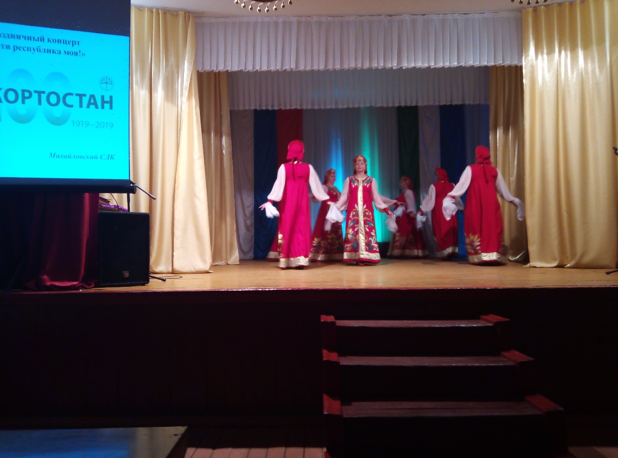 2 апреля в Михайловском СДК прошла концертная программа «Цвети республика родная» в рамках муниципального конкурса самодеятельного художественного творчества «Сделано в Башкортостане!» - среди предприятий и организаций СП Михайловский сельсовет, посвященный 100 – летию образованию Республики Башкортостан. В праздничном мероприятии приняли активное участие педагоги школы - интерната. В фойе дома культуры была оформлена выставка, посвящённая 100- летию Республики Башкортостан, которые подготовили наши педагоги и воспитатели. Прошли отборочный тур исполнив русский народный танец «Хохлома», заняли 1 место. И теперь будут принимать участие в районном конкурсе самодеятельного художественного творчества «Сделано в Башкортостане», посвященного 100-летию образования, который будет проходить в РДК с.Бижбуляк 23 апреля. Завершилось мероприятие зажигательным исполнением песни «Россия», в исполнении Г.Ф. Шишкиной и Н.А. Ефремовой.