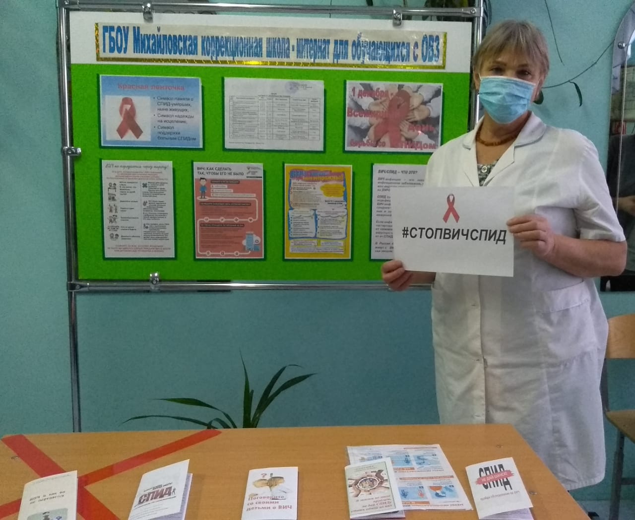 В Михайловской КШИ прошли мероприятия, посвященные этому дню. В начальных классах были проведены тематические классные часы, в фойе школы организована выставка рисунков и информационный стенд. Обучающиеся и сотрудники школы-интерната присоединились к всероссийской акции "#СТОПВИЧСПИД", раздавали жителям села буклеты и символ дня - красную ленту.